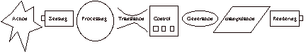 Again, defining the terms. Action is the physical phenomenon that will control or effect the media. Examples of this are the movement of an arm, breathing, or heat. Here, that what is detected is something within the environment and this can be the actions of a human body or some other physical system. Sensing is the act of transforming the physical phenomenon into a digital representation. Generally, sensing involves reading data from a sensor of some sort that measures some aspect of the physical world. This aspect, may be only a manifestation or parameter of the phenomenon, and not the phenomenon itself that is needed to be perceived. For instance, a video camera as a sensor does not register movement, it only registers reflected light. Processing is the algorithmic process of extracting meaning from the sensed data. In the case of a video camera that detects light, movement can be inferred by the changes in the image plane because light changes on objects when they move. Again, processing may not unambiguously extract meaning. In the case of a video camera, and extraction of movement, it is also true that when the light changes, things may not be moving. Translation is the process of taking data structures of represented meaning and producing signals that can be used by steps down the line such as a controller to generate or modify media.
