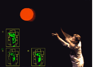 The Intelligent Stage is a mediated performance space that responds to the actions of performers as they move. The systems primary sensing occurs through a program called EYES that analyzes video activity to understand what is happening on stage [Figure 1]. (Speech recognition is also being researched as a another means of sensing). Sensing by the computer allows performers to control electronic theatrical elements such as sound, lighting, video, and slides through digitized video, photoelectric switches, contact switches, and many types of activities. Media responses occur through several controller computers that manipulate the theatrical electronic media.